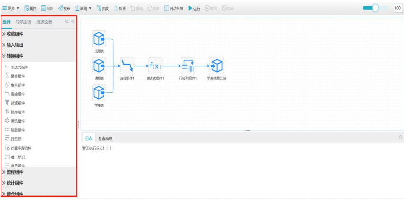 億信ABI中內置組件包括:輸入輸出組件、轉換組件、流程組件、統計組件、數倉組件、腳本組件、大數據組件等。面向數據分析師精心打造,滿足各種各樣的數據處理場景。
