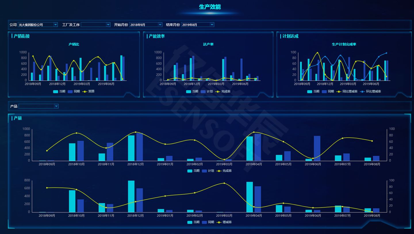 反映生產(chǎn)部門(mén)生產(chǎn)進(jìn)度執(zhí)行情況,考核生產(chǎn)部門(mén)的生產(chǎn)能力。涵蓋產(chǎn)量、產(chǎn)銷(xiāo)比、達(dá)產(chǎn)率、生產(chǎn)計(jì)劃完成率等考核指標(biāo),為領(lǐng)導(dǎo)管理生產(chǎn)線提供數(shù)據(jù)支撐。