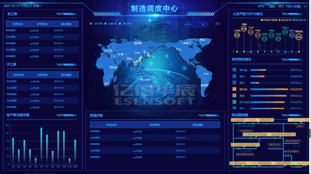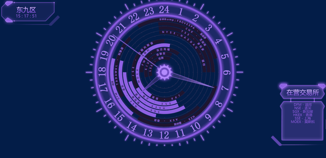 輔助圖表通常圍繞視覺(jué)中心的四周,起到錦上添花的作用,用來(lái)呈現(xiàn)次要指標(biāo),從各種維度進(jìn)一步細(xì)化核心指標(biāo)。時(shí)間類(lèi)組件 時(shí)鐘