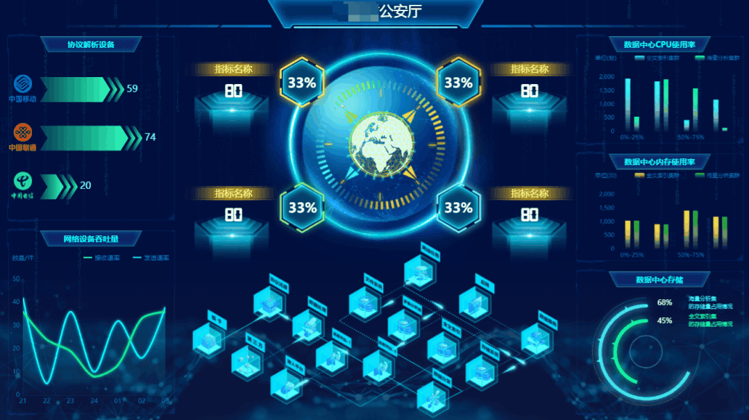 04 大屏可視化組件--輔助圖表 輔助圖表通常圍繞視覺中心的四周,起到錦上添花的作用,用來呈現次要指標,從各種維度進一步細化核心指標。 不需要設置任何數據,實時顯示的當下時間,并且以時鐘表盤的方式,古典有韻味。 05 大屏可視化組件--溫度計條形圖 條形圖是用寬度相同的條形的高度或長短來表示數據多少的圖形。借用溫度計的形象,生動展示數據占比的情況。 06 大屏可視化組件--3D網格線地球 有了這些組件,還怕做不出酷炫的大屏嗎?億信ABI值得擁有。 我們只需要在酷屏設計器拖拽組件即可實現,組件上的文本、數值全部支持界面化修改,方便我們快速轉化業務含義。