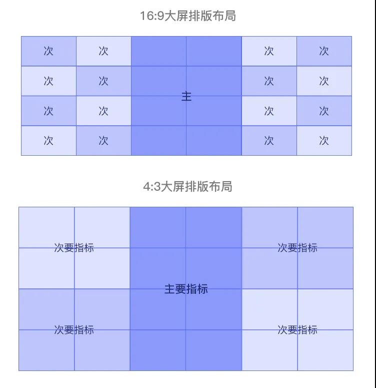 大屏可視化由于承載體的特殊性,有時候一個小小的差錯會使得效果千差萬別,如果客戶是4:3的屏,你大筆一揮設計成16:9的,那個壓縮效果不忍直視,怕是需求方要追著你打。所以做好前期調研很重要,包括大屏比例、材質,在哪里演示,對何人演示,有什么目的等。 下圖是不同比例大屏的分布策略,可供參考: